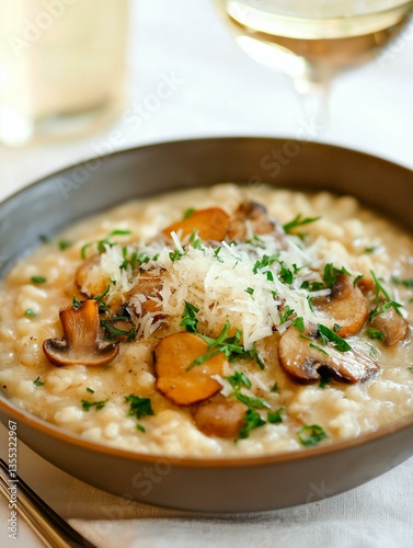 bowl, risotto, mushroom, grated, cheese, creamy, white, colours, sliced, arranged, circular, chopped, herb, scattered, dish, tablecloth, glasses, wine, background, spoon, resting, diversity, cooking, design