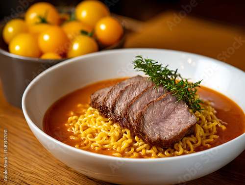 ramen, beef, noodle, soup, spicey, broth, herb, dinner, lunch, epicure, hot, bowl, asian, fusion, cherry, tomatoes, meal, meat, cookery, fresh, delicious, hearty, homemade, comfort, food, rich, steaming, receipe, dish, savoury, tasty
