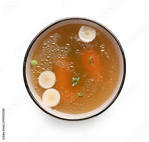 Bowl of tasty vegetable broth on white background