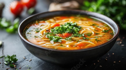 soup, noodle, tomatoes, broth, parsley, bowl, vegetable, lunch, dinner, healthy, food, meal, asian, chinese, japanese, korean, cookery, delicious, tasty, flavorful, fresh, homemade, comfort, warm, hearty, spicey, vegetarian, vegan, appetising, alimentary, natural, organic, simple, easy, quick, fast, cooking, receipe, dining, eatery, cafes, home, family, friends
