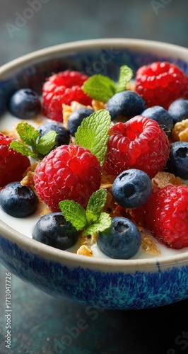 Bowl of yogurt topped with granola, raspberries, blueberries, and mint