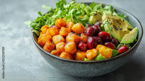 Bowl salad with avocado in a bowl on white isolated background