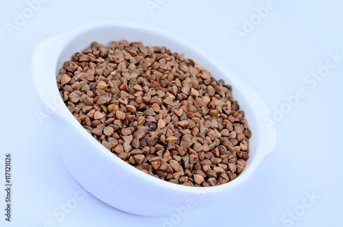 healthy, food, raw, diet, grain, cereal, buckwheat, bowl, brown, seed, groats, nourishment, meal, breakfast, dish, dry, health, kernel, whole, eating, dinner, calorie, ceramic, blue background