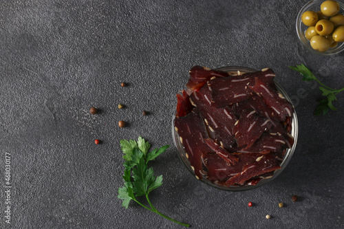 Bowl with jerky meat, olives, peppers and parsley on a dark gray background
