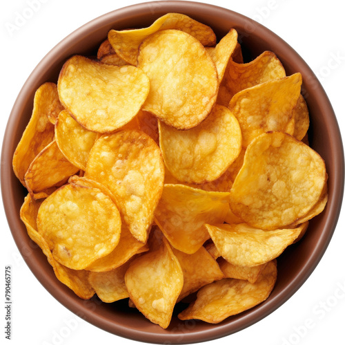 Bowl with potato chips isolated. Top view.