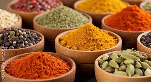 Bowls of spices representing culinary variety and flavor, with wooden containers