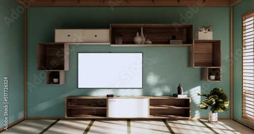 Box Wall Shelves on living room japanese style, tatami mat and decoration lamp and plants on mint zen room.3D rendering