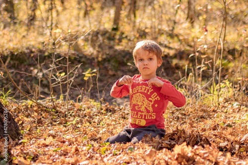 boy 4 years old sits in leaves in nature on a sunny warm autumn day
