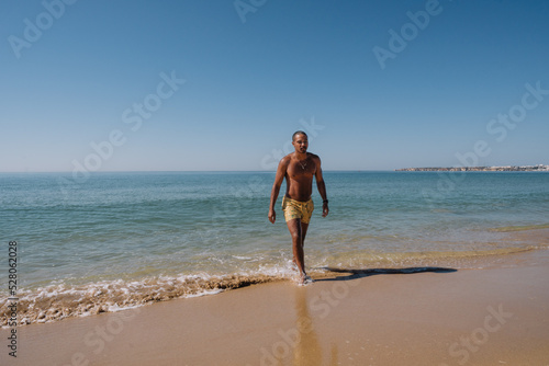 BOY COMING OUT OF THE SEA ON HIS VACATION AND WALKING ON THE BEACH