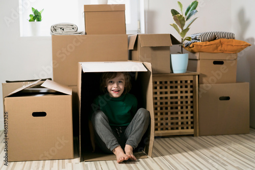 Boy hiding in inside a huge cardboard box. He is playing and looking out of a box. Kid is happy about moving into a new home.