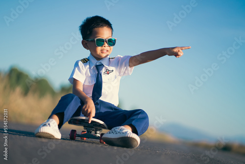 Boy in dark glasses in pilot suit pointing hands on street skateboard in vintage tones