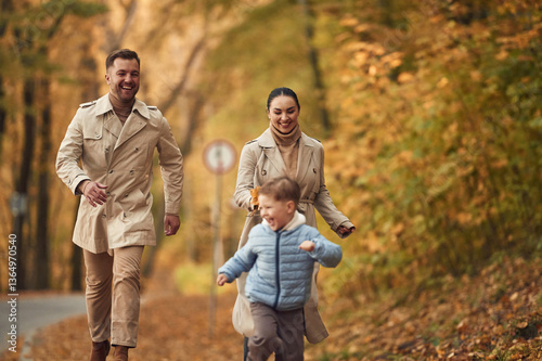family, mother, father, son, happy, boy, running, forward, active, people, together, autumn, forest, wood, tree, orange, fallen, leaf, near, road, male, female, man, woman, children, children, warm, clothes, wear, walk, weekend, cheerful, positive, lovely, adult, care, outside, nature, joy, three, wellness, well-being, leisure, free, time, facial, expression, friendly