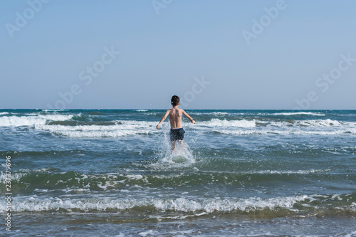 Boy Jumping In Sea Waves with Water Splashes. Concept of summer vacation