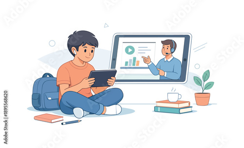 boy, learning, online, tablet, virtual, education, digital, student, school, e-learning, technology, classroom, cyberspace, tutor, course, study, interactive, video, lesson, remote, desk, book, plant, earphones