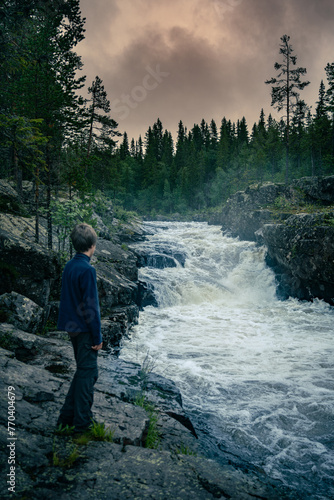 boy, observing, waterfall, forest, dusk, standing, powerful, rapid, sweden, orange sky, dramatic sky, watching, looking, fog, adventure, awe, cascade, childhood, environmentally friendly, ecotourism, evening light, flowing water, landscape, natural beauty, nature, nordic, pine tree, remote, river, river bank, rural, scandinavian, scenic, serene, solitude, stream, tranquil, travel destination, tree, untouched, watercourse, wild, wilderness