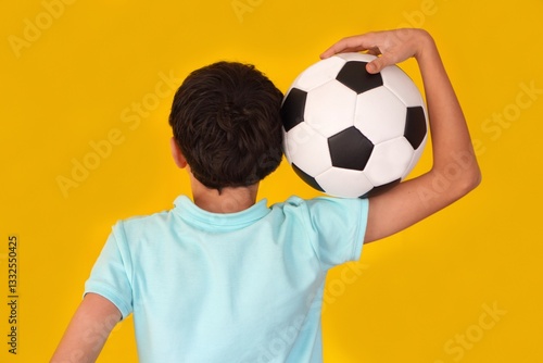 teenage, boy, back, soccer, ball, shoulder, blue, polo, shirt, yellow, background, athlete, sporty, confident, young, casual attire, focused, isolated, portrait, energetic, dynamic, determined, football, player, aspiring, strength, balance, skill, vibrant, playful, enthusiasm, motivation, stylish, relaxed, activity, training, physical, education, healthy, habit, discipline, coach, club, succeed, faceless, sport, athletic