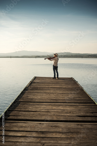 boy plays the violin on the lake