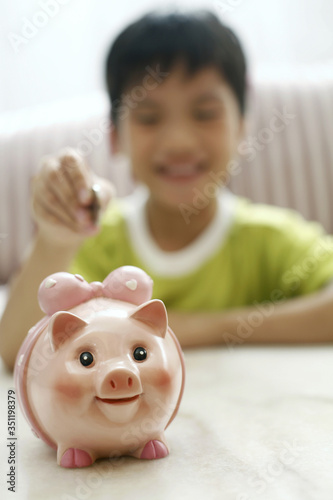 Boy putting coin into piggybank