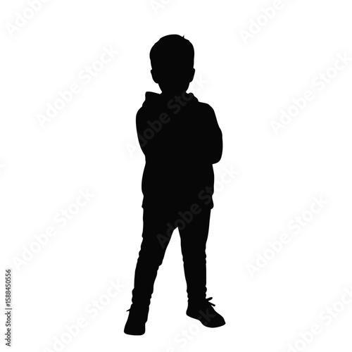 boy, children, silhouette, standing, confident, arms crossed, casual attire, clothing, pant, shoe, isolated, white background, full body, portrait, young, person, male, children, childhood, expression, pose, simple, graphic, design, vector
