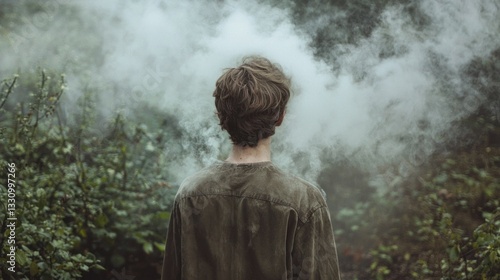 boy, fog, forest, smoke, backview, nature, tranquil, eerie, youth, solitude, mystery, dreamy, outdoors, greenery, environment, calm, aethereal, illusion, escape, fantasy, atmospheric, quiet, scenery, exploration, adventure, wonder, beauty, portrait, lifestyle, emotional, pensive, landscape, wild, serenity, whimsical, depth, connection, mist, wanderlust, journey, atmosphere, scene, enchanted, peaceful, photo, artistic, natural, imagery