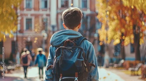 Boy with backpack going to school. The new academic semester year start with friend at school background , Generative Ai