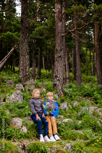 Boy with glasses and blue wear with bouquet of wild flowers and blonde girl near the forest in the summer mountains. Flowers for mother and sister for the woman’s day. RUSSIA, LAGO-NAKHI, July 2018