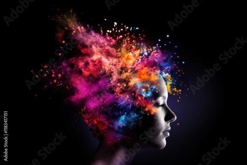 abstract, portrait, brain, adult, head, person, black background, colourful, design, light, fire, art, darkness, paint, exploding, accessory, silhouette, fireworks, purple, woman, blue, face, graphic, photo, modern art, surreal, powder, flames, human, photo, creativity, concept, female, nebula, image, holi, closeup, vibrant color, beauty product, young adult, head shot, balefire, motion, make-up, human face, human head