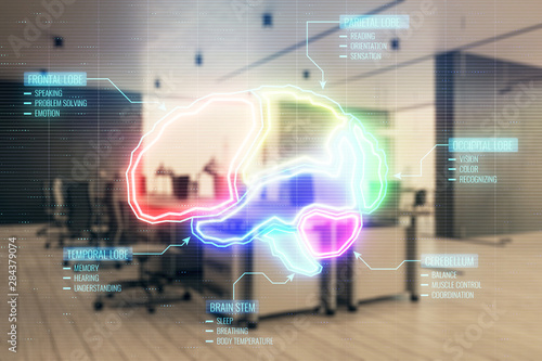 Brain icon hologram with office interior on background. Double exposure. Concept of education