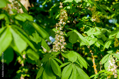 Branch chestnut closeup. White chestnut flowers photographed against the background of lush green leaves
