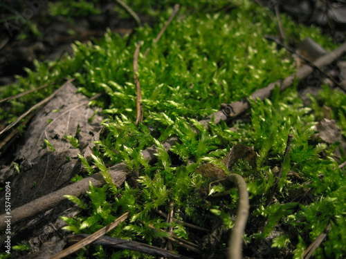 Branch in green moss with dry leaves at spring forest