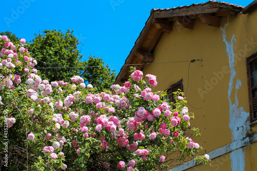Branches laden with pale pink roses, bright green foliage and blue sky, yellow cottage in the background.