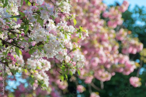 branches of apple quince tree in blossom. blooming garden on the blurred background. sunny springtime forenoon.