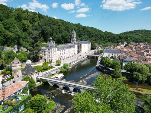 Brantome abbey and stone bridge France in Dordogne medieval town drone,aerial