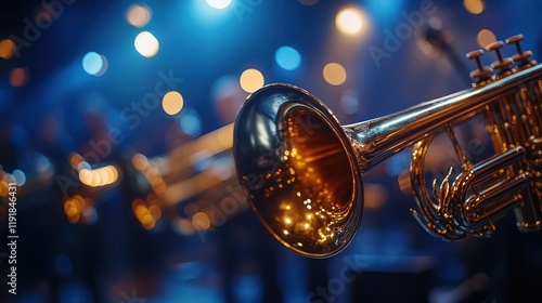 trumpet, brass, instrument, music, band, concert, stage, light, performance, jazz, melody, rythm, harmony, sound, audio, gold, shine, glow, bright, dark, blue, night, blurred, background, bokeh, closeup, detail, sharpened, professional, event, show, entertainment, musical, artistic, art, culture, symphony, orchestra, photo