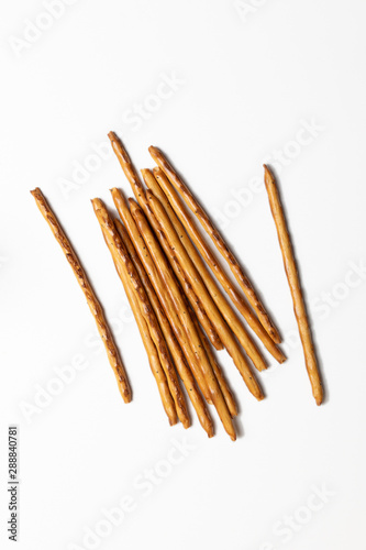 bread sticks scattered on white background, crispy snack with poppy seeds