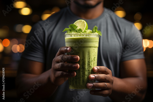 Break time. Man with towel and glass of detox cocktail. fitness man . Health concept. Health, drink and detox smoothie for diet, breakfast and protein. Nutrition, food, glass for green juice, vitamins