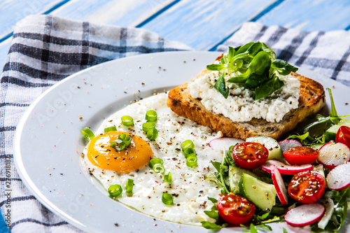 breakfast, egg, egg, yolk, fried, fried egg, sandwich, toast, toast, english, food, bread, bungalow, cheese, chives, radish, morning, dish, meal, salad, lunch, tomatoes, vegetable, fat, roast, slice, arugula, plate, tomatoes, lettuce, cucumber, pepper, yellow, strip, crispy, greasy, bistro, portion, toasted, roasted, eatery, horizontal, european, wooden, background