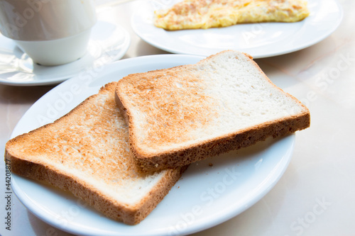 egg, jam, bake, bakery, bread, breakfast, bun, hot drink, cookery, cup, drink, food, french, gold, juice, orange, pastry, snack, toast, traditionally, white, yellow