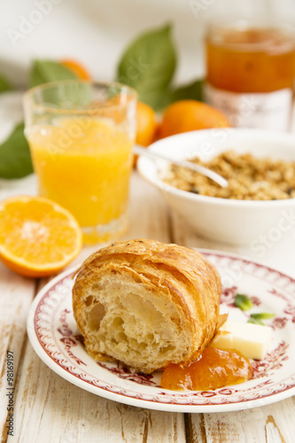 bakery, bran, breakfast, butter, cinnamon, citrous, croissant, food, french, fresh, fruit, glasses, granola, green, jam, juice, knob, leaf, marmalade, mint, morning, muesli, napkin, oatmeal, oat, orange, plate, grape, spice, spicey, spoon, summer, table, mandarin orange, traditional, vitamin, yellow