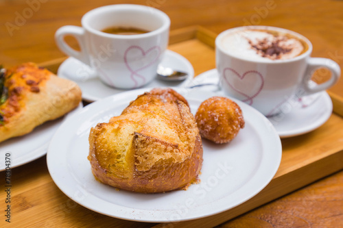 breakfast, hot drink, cup, cappuccino, tray, saucer, sugar, spoon, delicious, fresh, bun, donut, brioche, crust, crisp, ruddy, nubes, love, rest, powdered sugar, bistro, bakery, hot, big, small, together, wood, tradition, europa, dough, start, day, good, 2, white