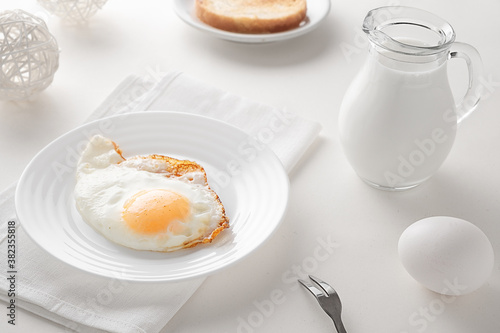 Breakfast fried eggs and a decanter of milk in a high key on a white table