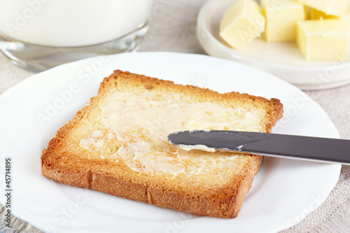 breakfast, food, morning, easy, toast, bread, cracker, dry, chunk, piece, roasted, butter, creamy, milk, glasses, transparent, plate, saucer, white, napkin, grey, fabric, table, appetising, tasty, knife, tableware