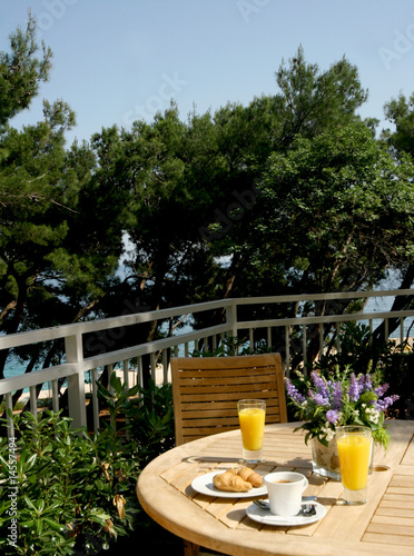 breakfast, hotel, orange, juice, hot drink, sea, vacation, croissant, flower, summer, nature, holiday, beautiful, nice, relaxation, food, drink, sky, blue