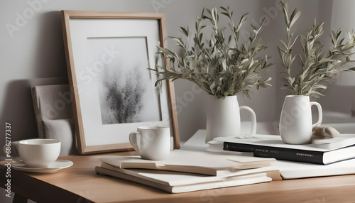 frame, picture, wall, photo, table, room, art, mock, interior, up, poster, background, home, office, blank, hot drink, white, decor, modern, design, template, display, scandinavian, vertical, olive, cup, wooden, vase, lifestyle, beige, tree branch, tree, breakfast, indoor, mug, leaf, old, drink, style, concept, book, decoration, artistic, mock-up, copy space, living, no people