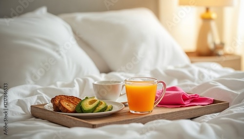 breakfast tray with croissant, sliced avocado, orange juice, and coffee on a white bed, cozy and nutritious morning setup