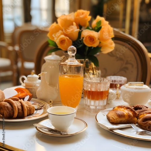 breakfast, hot drink, food, cup, tea, dessert, cake, drink, plate, sweet, orange, white, bread, table, croissant, fruit, delicious, morning, sugar, juice, milk, spoon, fresh, pastry, chocolate