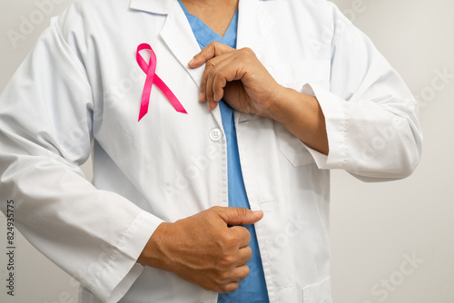Breast cancer, Asian doctor woman with pink ribbon, symbol of World Breast Cancer Day.