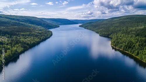 Breathtaking aerial view of calm river flowing through dense green forest landscape : Generative AI