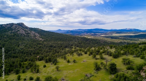 Breathtaking aerial view of lush green hills and mountains under a vast blue sky : Generative AI