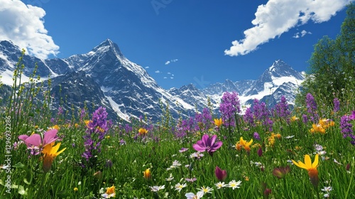 alpine, meadow, spring, wildflower, purple, yellow, pink, snow, peak, mountain, landscape, nature, scenery, vibrant, bloom, flora, rural, seasonal, travel, adventure, calmness, beauty, scenic, lush, colourful, clear, sky, cloud, bright, picturesque, sunny, environment, wildlife, grass, field, serene, peaceful, view, natural, fresh, remote, harmony, exploration, hiking, blossom, freshness